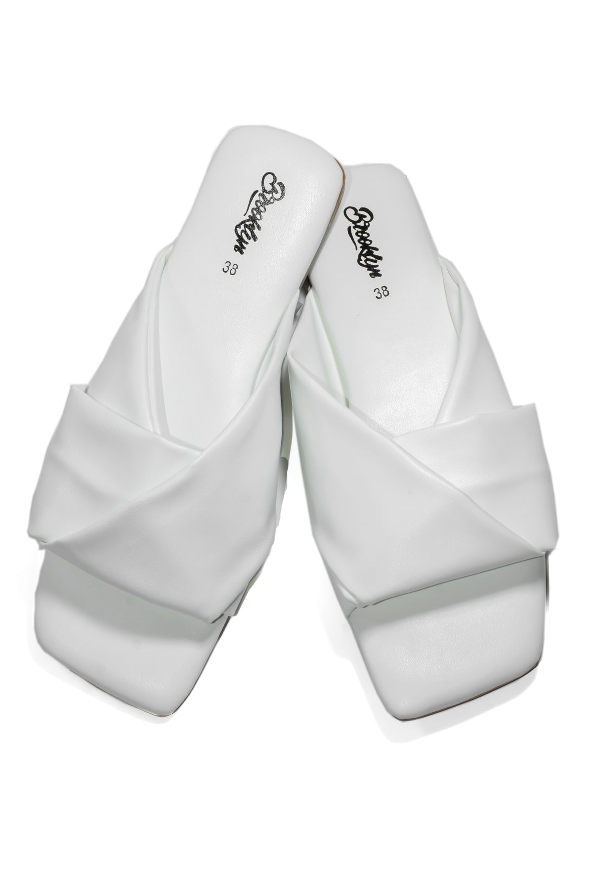 Premium white leather construction Stylish crossover strap design Comfortable cushioned footbed Easy slip-on style for convenience Square toe design for...