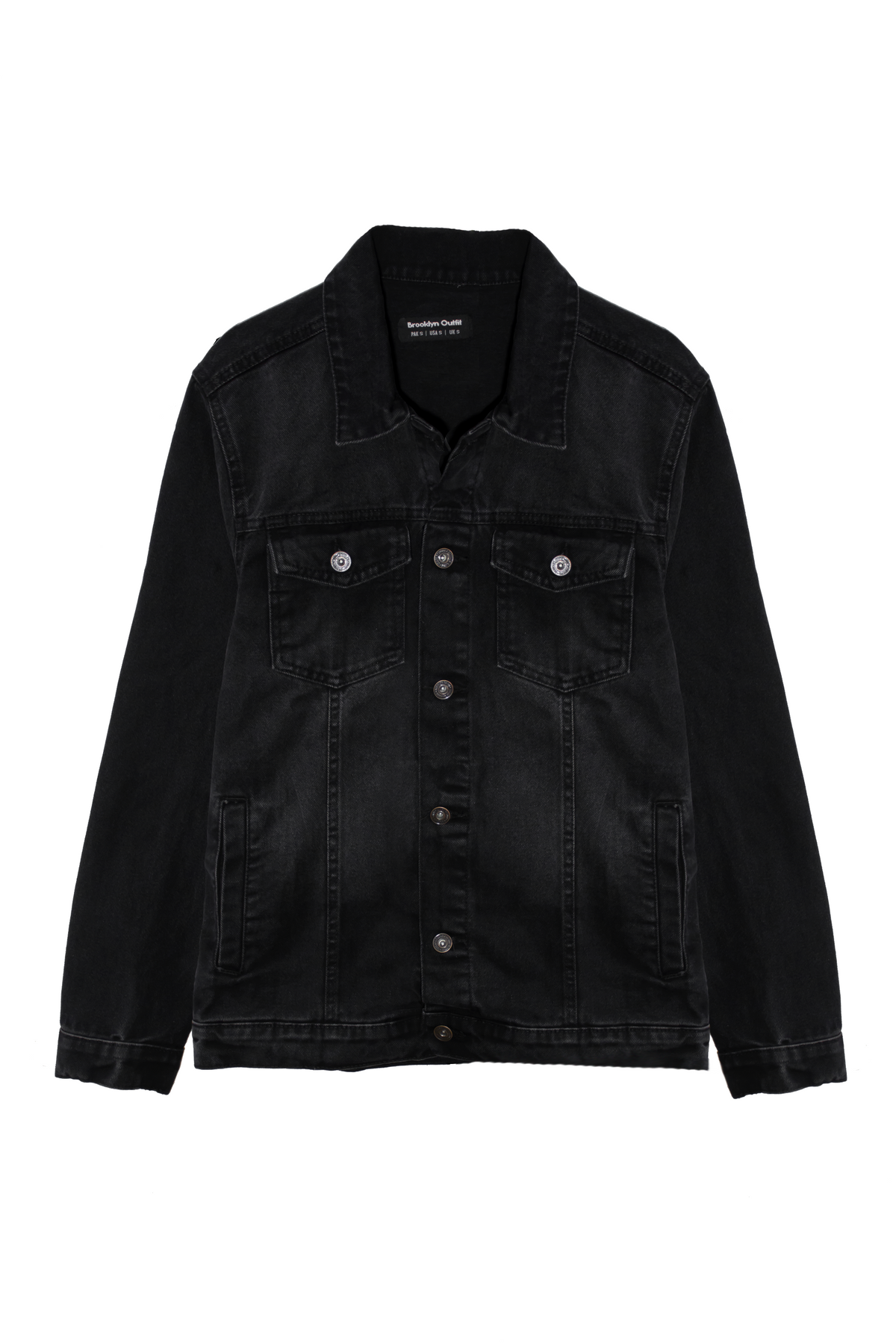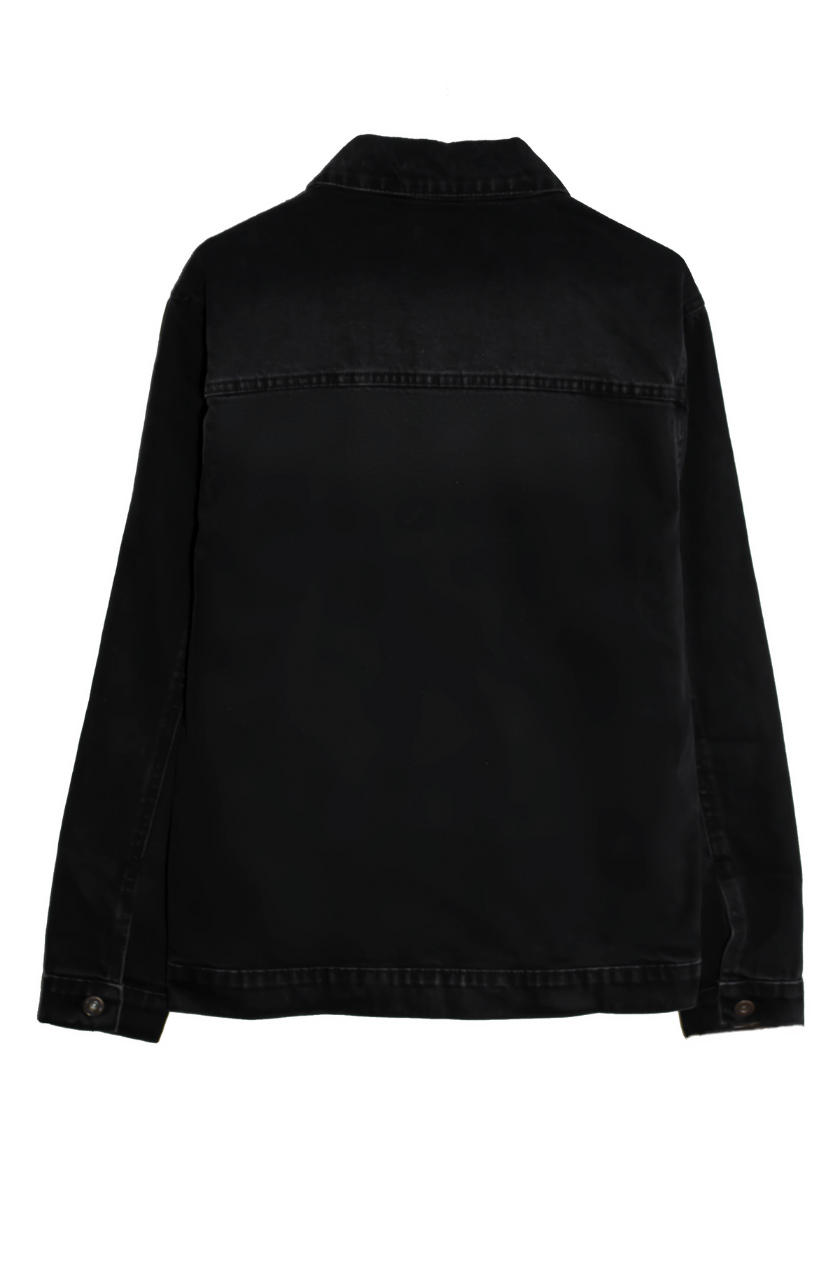 Premium black denim construction Classic collar design Button-front closure Two chest pockets with button flaps Two side pockets Durable stitching...